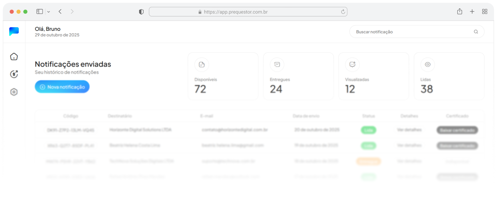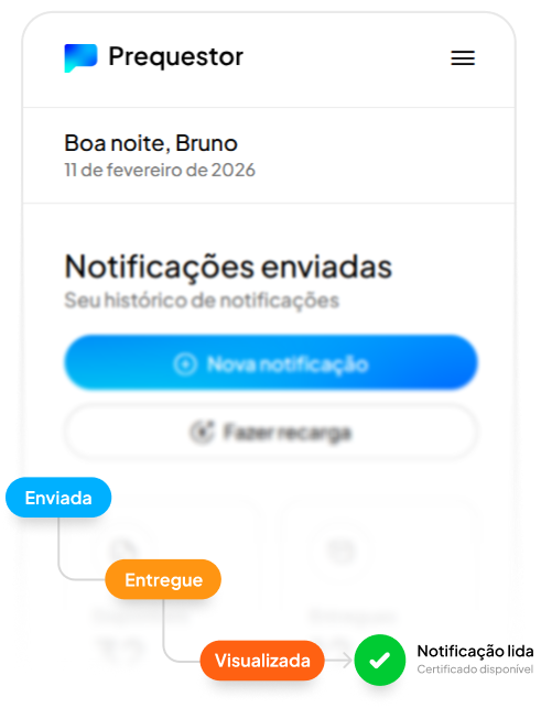 O Prequestor acompanha o status da notificação em tempo real. Você poderá visualizar se a mensagem foi enviada, entregue, visualizada e lida pelo destinatário. Após a leitura, um certificado criptografado é gerado com todas as informações de datas, horarios, IP e demais registros.